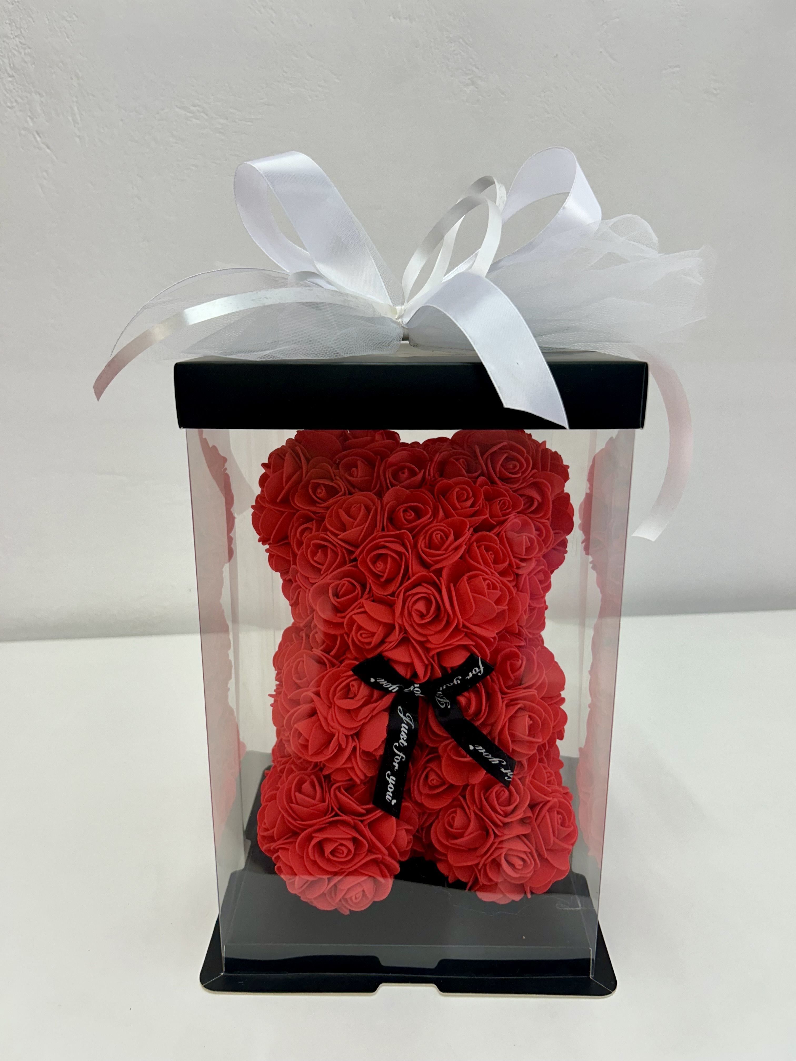 Αρκουδάκι από τριαντάφυλλα - Rose Bear! Ένα υπέροχο χειροποίητο αρκουδάκι από τεχνητά τριαντάφυλλα ανώτερης ποιότητας που διαρκούν για πάντα. Το αρκουδάκι τοποθετείται μέσα σε διαφανές κουτί με καπάκι και κορδέλα. Ένα υπέροχο δώρο για τους αγαπημένους σας.