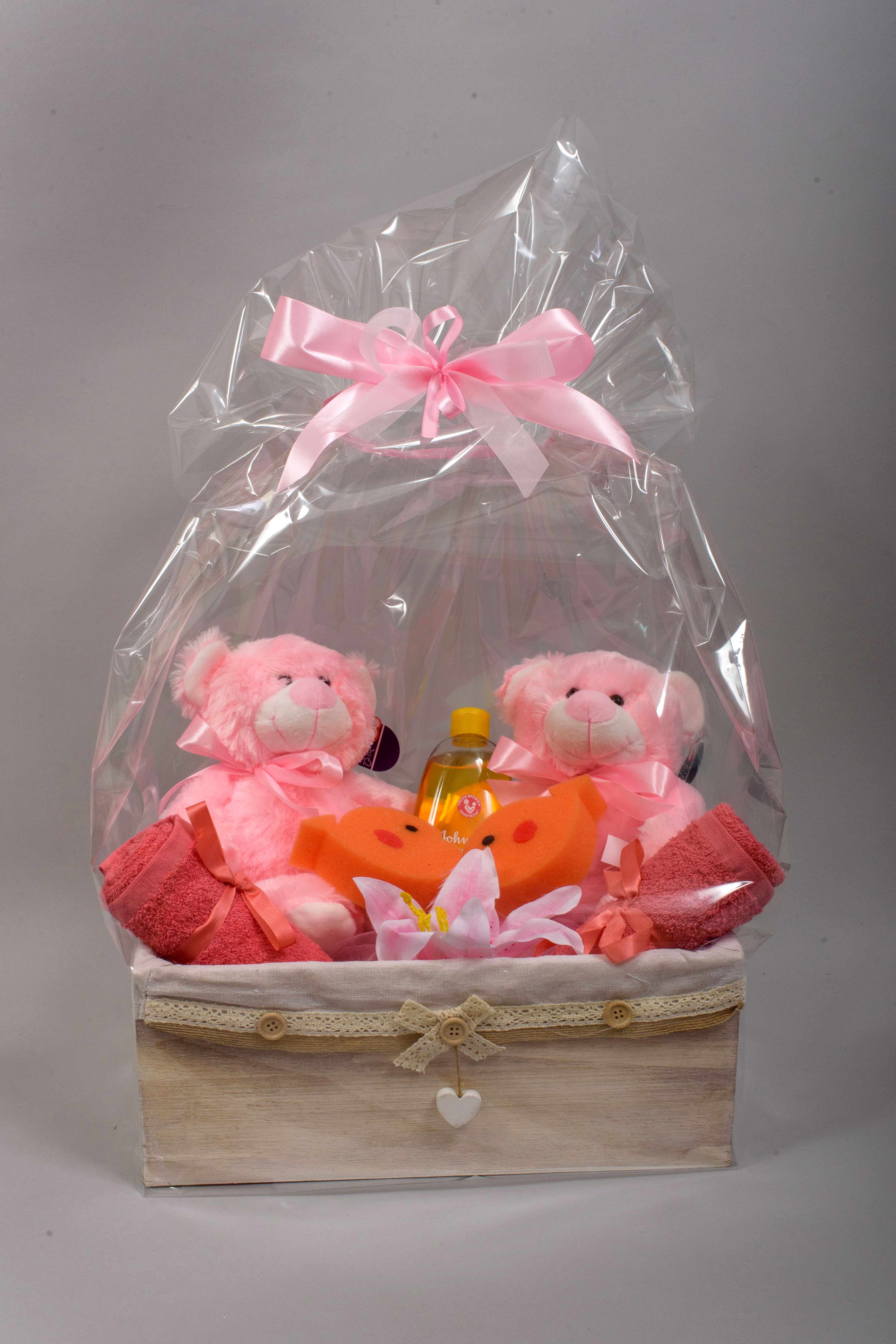 Το σετ περιλαμβάνει 2 λούτρινα 30εκ., 2 πετσέτες μπάνιου, σαμπουάν 500ml και 2 σφουγγάρια για τα πρώτα μπάνια τους!
